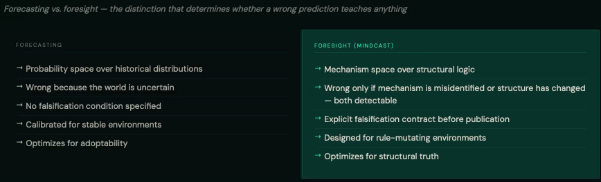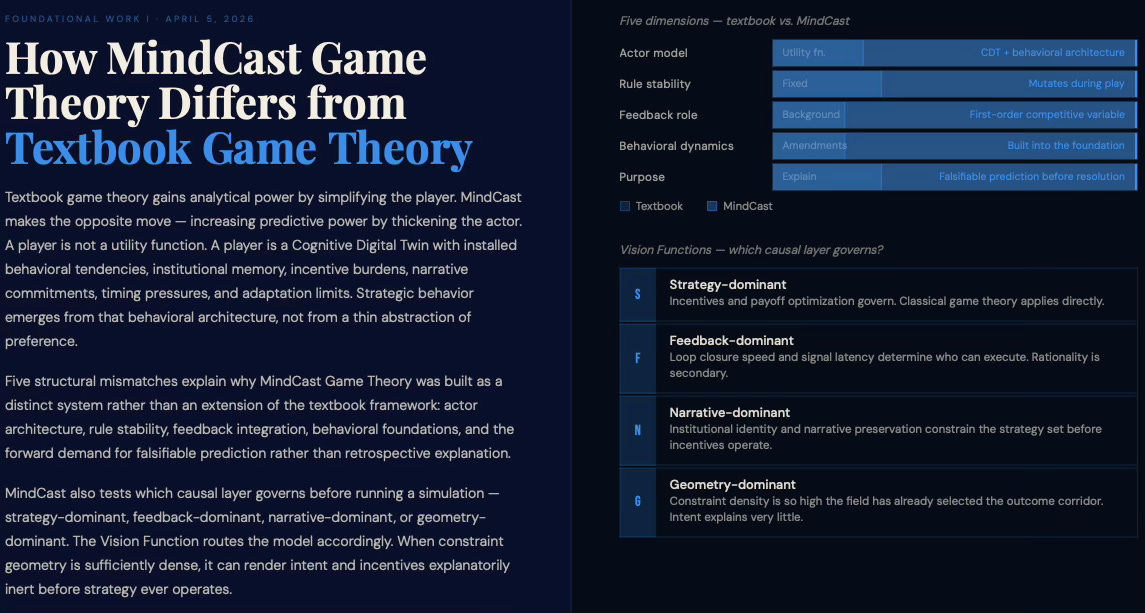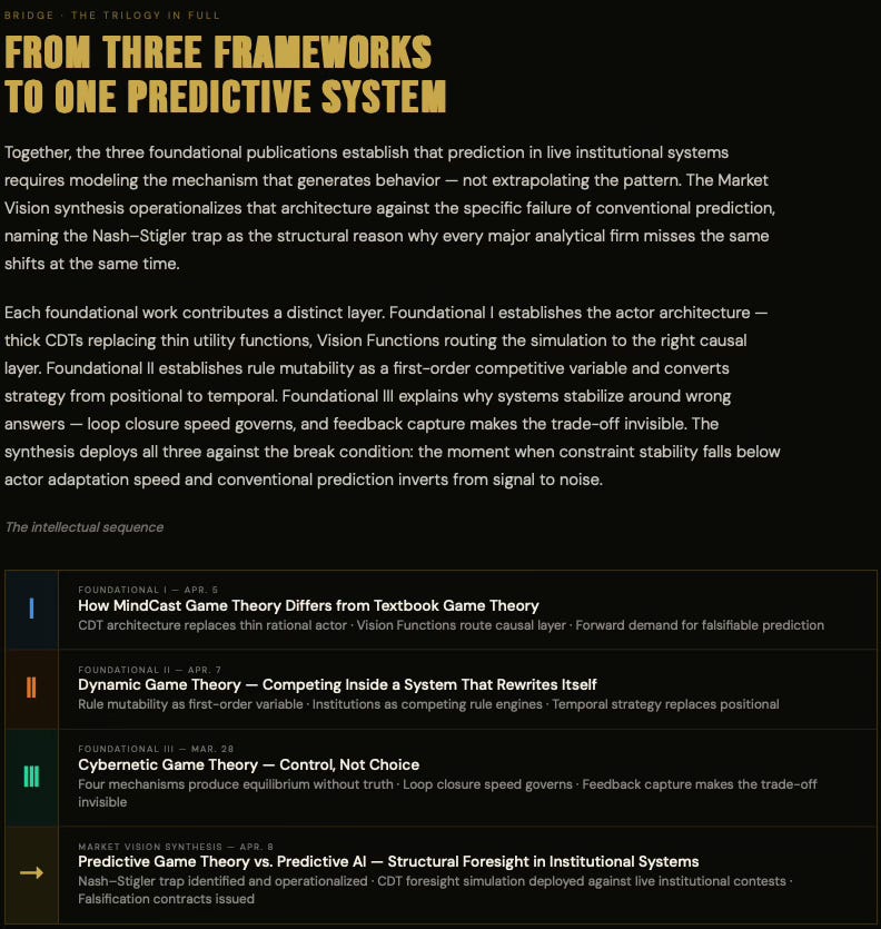 MindCast AI is the next generation predictive AI system. Game theory, cybernetics, and behavioral economics cognitive digital twins are the underlying architecture — what distinguishes MindCast from current market predictive AI. Three foundational publications establish that architecture. The Market Vision synthesis deploys it as a live institutional foresight system with falsification contracts. MindCast Predictive Game Theory vs. Predictive AI— Structural Foresight in Institutional Systems
