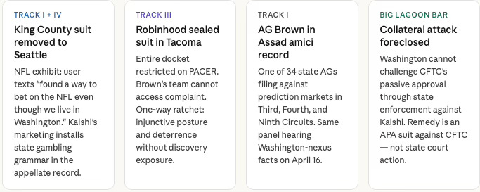 Washington is not simply the most active enforcement jurisdiction — it is where all four litigation tracks activate simultaneously within the same circuit that will hear oral argument on April 16. The NFL advertising exhibit, the sealed Robinhood filing, the AG’s amicus participation in Assad, and the Big Lagoon collateral attack bar all converge in a single state, generating more appellate signal than any other jurisdiction in the map.