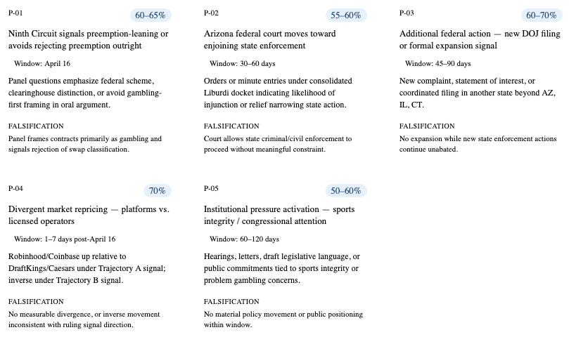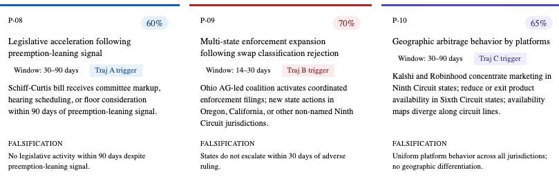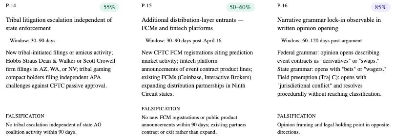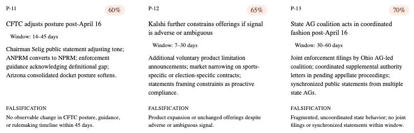 These three predictions are trajectory-conditioned — each activates only if the April 16 signal routes toward the specified trajectory. They test whether the downstream institutional behavior predicted by each trajectory actually materializes within the defined time window after the signal.