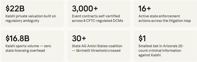 Federal intervention has converted fragmented state enforcement into a coordinated four-track jurisdictional collision. These six figures anchor the scale of what April 16 will move — from Kalshi’s $22 billion private valuation to the $1 bets at the center of Arizona’s criminal prosecution.