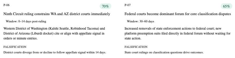 Second-order predictions test whether the structural forces identified in the CDT simulation produce observable downstream effects beyond the primary legal actors. Tribal escalation, new fintech distribution entrants, and the narrative grammar embedded in the written opinion are all second-order outputs of the system — but each is falsifiable and time-bound.