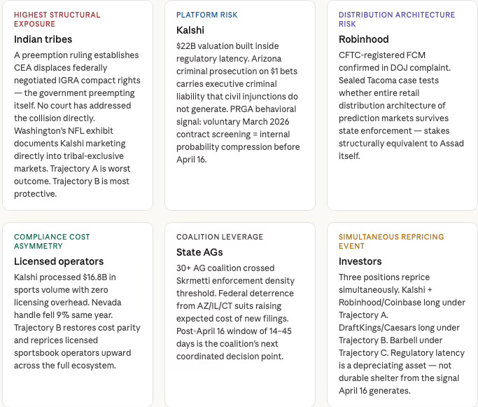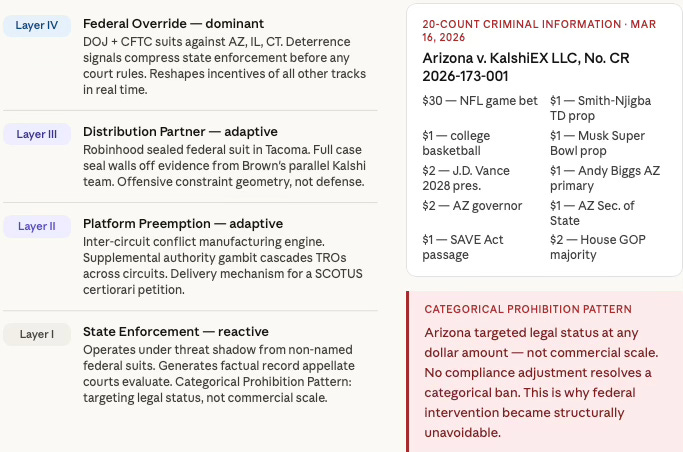 The dominant analytical error in coverage of this litigation is treating the four tracks as co-equal. They are not. Federal override actively reshapes the feasible action set of every track below it — raising the expected cost of state enforcement before any court rules, and converting Kalshi’s and Robinhood’s strategies from offensive to adaptive. The track hierarchy is causal, not merely descriptive.