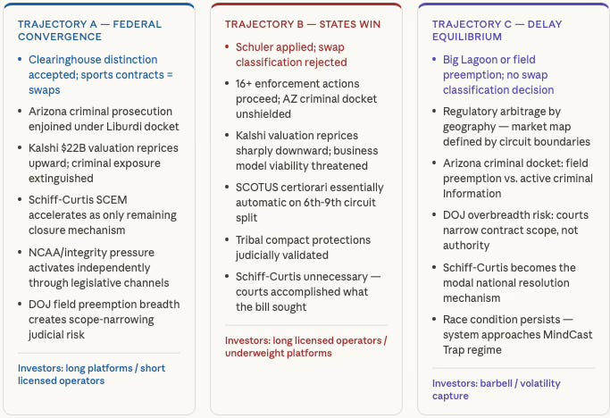 April 16 does not produce a single outcome. The consolidated oral argument generates a signal that routes the entire prediction market regulatory contest down one of three distinct institutional pathways. Each trajectory produces a different consequence chain across legal, regulatory, legislative, market, and industry structure dimensions — cascading through the 45 to 90 days that follow.