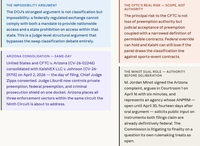 The DOJ’s most powerful argument does not turn on swap classification — it turns on physical impossibility. A DCM that is federally mandated to provide nationwide access cannot simultaneously comply with a state prohibition on access within that state. On the same day the DOJ filed, Judge Liburdi consolidated the federal suit with the existing Kalshi Arizona proceeding under a single docket — collapsing private preemption, federal preemption, and criminal prosecution shield before one judge.