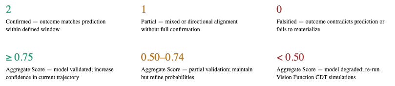 Every prediction is time-bound, carries an explicit probability band, a named signal condition, and a falsification condition. Post-April 16 scoring runs on the 0–2 scale. Aggregate Score ≥ 0.75 = model validated. AS < 0.50 = full CDT re-run triggered.