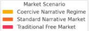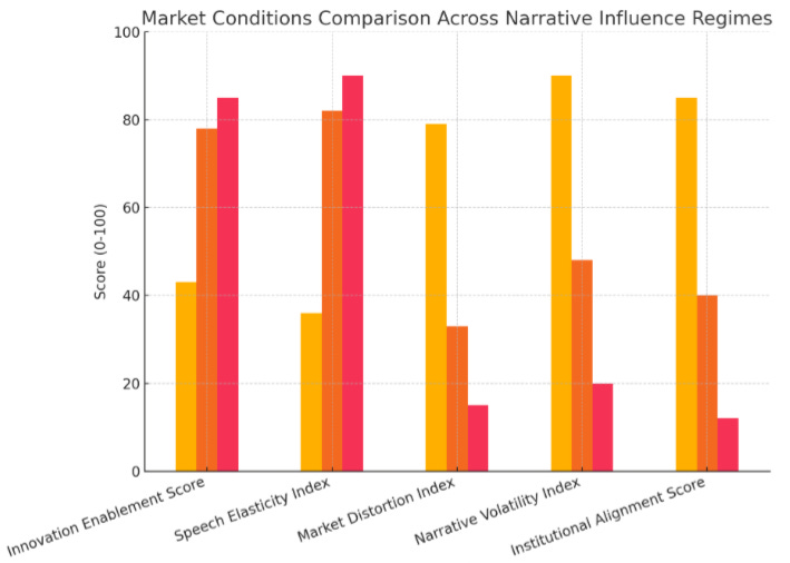 To understand the impact of narrative enforcement, MCAI modeled three economic systems: a coercive narrative regime, a standard narrative market, and a traditional free market. Metrics were generated using behaviorally anchored simulation logic and stress-tested against CDT outputs.