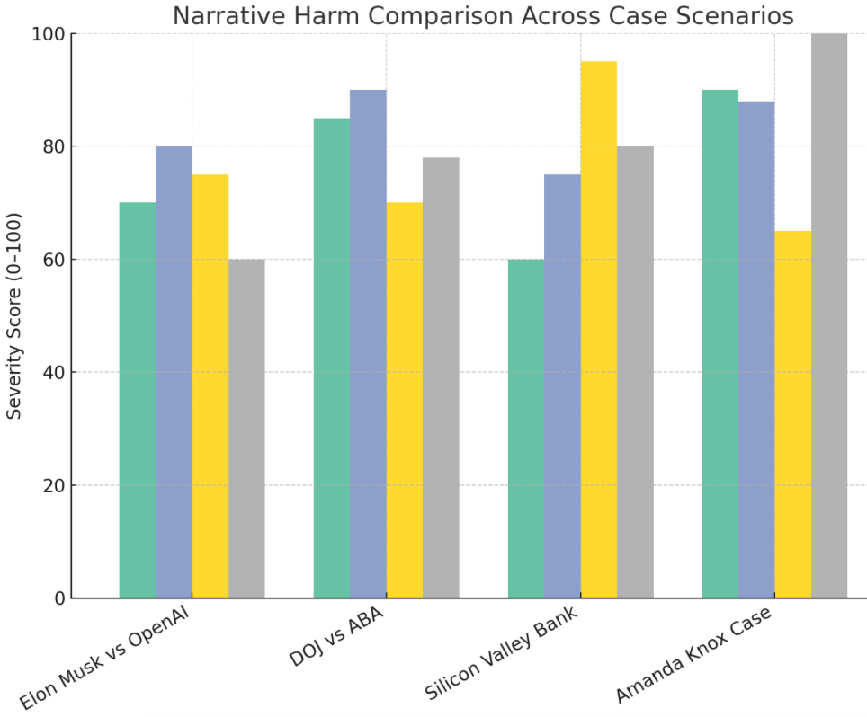 Amanda Knox registers the highest human cost, showing how narratives can result in catastrophic legal and personal harm.