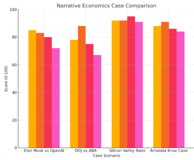 Amanda Knox and DOJ vs ABA both demonstrate high Institutional Response, showing how narratives can reshape legal and regulatory behavior even outside economic contexts.