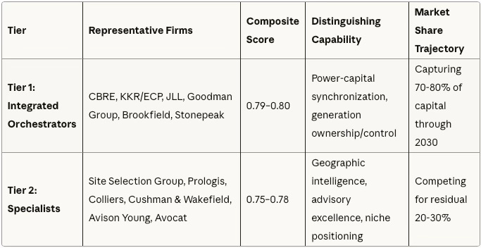 Power integration correlates with delivery reliability. Firms owning or controlling generation (Goodman 0.79, KKR/ECP 0.80) consistently outperform those relying on third-party PPAs (Prologis 0.78, Avison Young 0.76). The delta isn’t capability—it’s control. When utilities face capacity constraints, power-sovereign firms maintain schedules while PPA-dependent competitors slip.