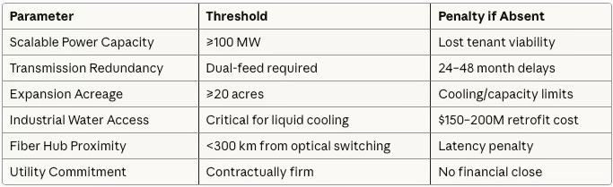 Network latency requirements for training clusters demand sub-millisecond interconnect across thousands of nodes. Only sites within 300 km of fiber hubs and optical switching stations support distributed AI workloads. Geography no longer means proximity to users but proximity to photons.