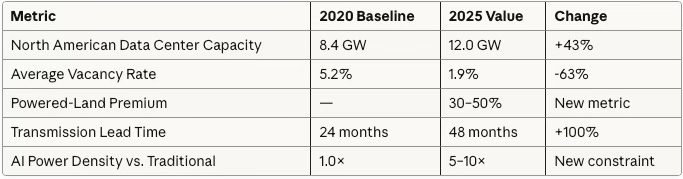 Northern Virginia once anchored global data center development. Today, despite more than four gigawatts of active capacity, vacancy sits below 2%. In the Carolinas, land values along new transmission corridors have tripled in three years because utility commitments arrive in under eighteen months. Phoenix faces doubled lead times from water constraints and permitting friction, pushing developers east into New Mexico and west into Texas. Every geography tells the same story: energy has become destiny.