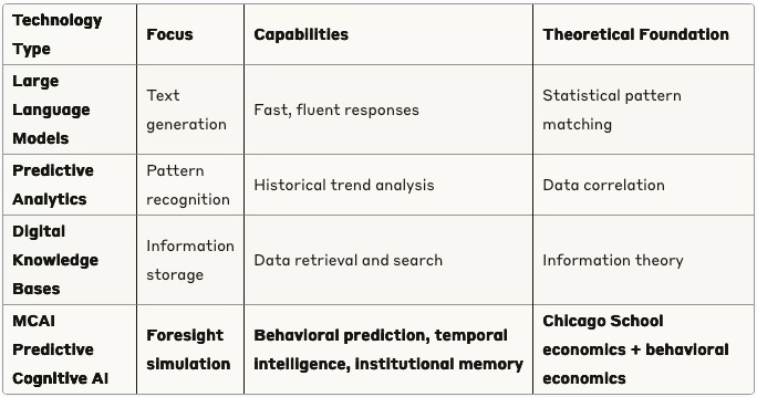 MCAI is a predictive cognitive AI platform building proprietary Cognitive Digital Twins (CDTs)—the world's first cognitive infrastructure that serves as the memory palace of institutions, enabling organizations to think with foresight, preserve wisdom across generations, and make decisions that honor both legacy and future possibility. Our CDTs can model people, groups, institutions, policies, public opinion, market dynamics, and technological innovation patterns.