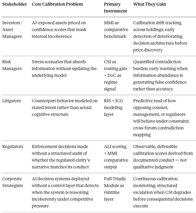 Each stakeholder group represents an institution already operating in the environment the Triadic Calibration System was built to address: high information volume, adversarial counterparts, consequential outputs, and no existing instrument to measure whether the decision architecture is functioning or merely appearing to function. MMI gives each of them a number they can track, report, and defend. CSI gives the system a gate that enforces calibration before inference propagates forward. Together they close the gap between analytical activity and analytical integrity.
