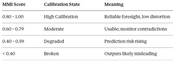 Every runtime output from the Triadic Calibration Module produces a headline MMI score alongside its component values — giving institutions a single trackable number that encodes the full calibration picture and supports comparison across actors, time periods, and decision environments.