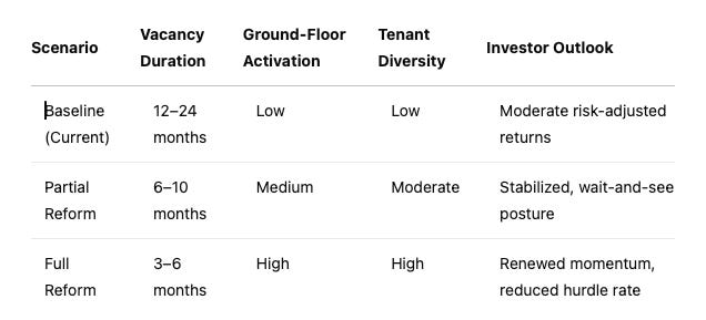 Powered by MCAI’s Forecast module, the following projections model how different reform scenarios affect vacancy, tenant diversity, and investment posture.