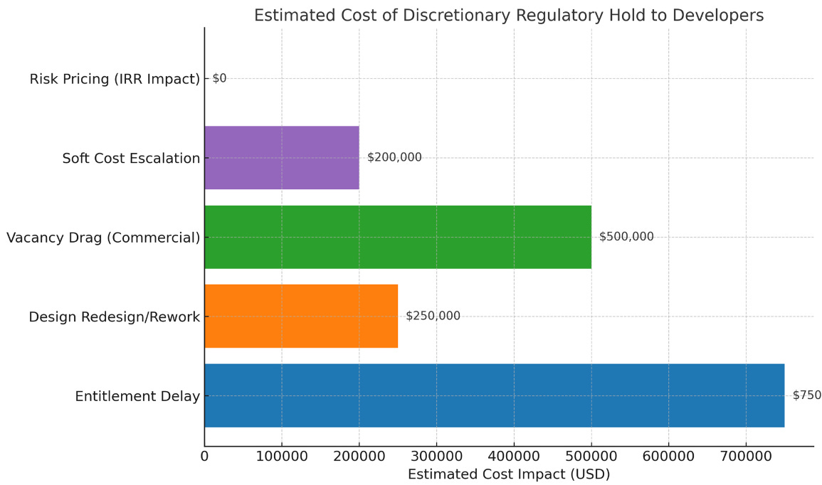 Many developers operate on tight timelines to secure favorable financing terms. When discretionary hold-ups delay entitlements or introduce unexpected review cycles, it can cause sponsors to miss their capital lock-in window. This forces them to accept higher interest rates or restructure deals—adding millions in long-term costs or causing projects to fall through altogether. These timeline-sensitive risks are often invisible in the code but felt acutely in the capital stack.