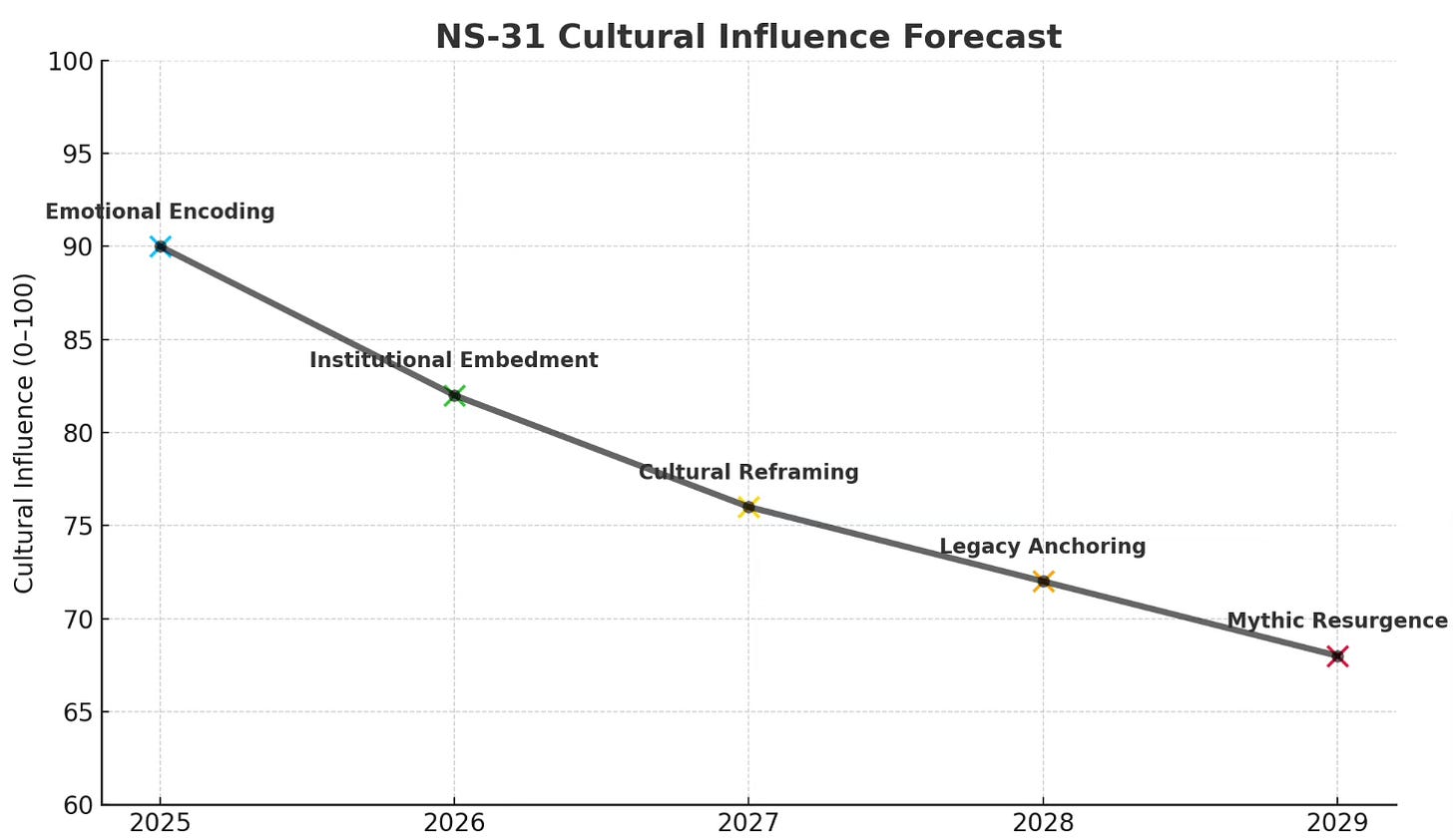 Narrative Lifecycle: Viral Lift → Emotional Encoding → Institutional Embedment. This progression tracks how a symbolic event evolves from initial attention into long-term cultural relevance. NS-31 is currently bridging between emotional resonance and institutional reference, positioning itself for integration into educational and civic memory systems.