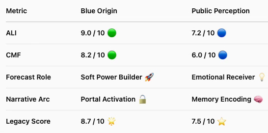 These metrics reflect symbolic integrity, strategic coherence, and the depth of memory activation. Blue Origin delivered a high-ALI event with measurable downstream resonance. The public, especially younger demographics, registered emotional alignment and retained symbolic meaning. Together, this dynamic strengthens long-cycle legitimacy.