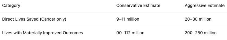 Quantum computing holds the potential to directly or materially improve the lives of over 100 million (conservative case) to over 200 million (aggressive case) people globally over the next 20 years, with life-saving interventions particularly concentrated in cancer and neurodegenerative research.