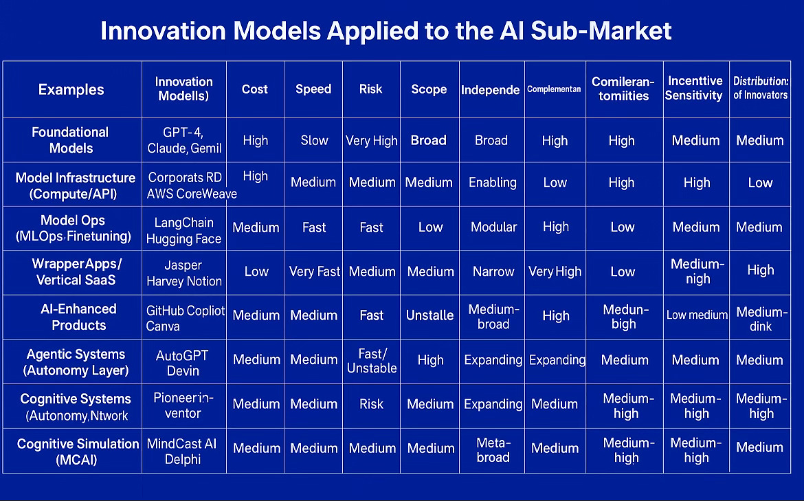 Understanding the diverse mechanics of innovation is essential to clarifying how the AI markets operate beneath the surface. Mark Lemley's typology of innovation models offers a powerful structure for mapping these differences—particularly in cost, speed, independence, risk, and strategic leverage. Each AI submarket aligns with a distinct innovation type, influencing how capital should be deployed, what risks matter most, and where structural moats actually lie. Without recognizing these distinctions, investment strategy drifts into narrative and noise.