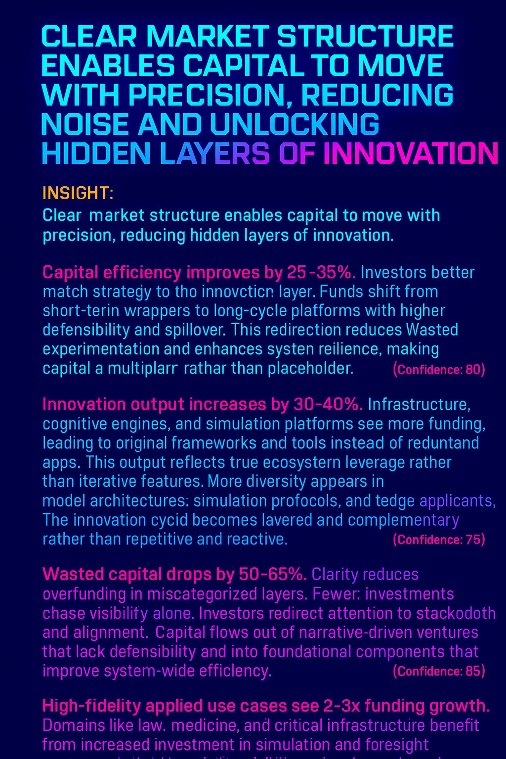 Capital efficiency improves by 25–35%. Investors better match strategy to the innovation layer. Funds shift from short-term wrappers to long-cycle platforms with higher defensibility and spillover. The overall return profile stabilizes as capital avoids narrative volatility. This redirection reduces wasted experimentation and enhances system resilience, making capital a multiplier rather than a placeholder. As capital flows into the correct market layers, companies gain longer runways to develop durable moats and compound structural advantage.Funds shift from short-term wrappers to long-cycle platforms with higher defensibility and spillover. The overall return profile stabilizes as capital avoids narrative volatility. (Confidence: 80%)