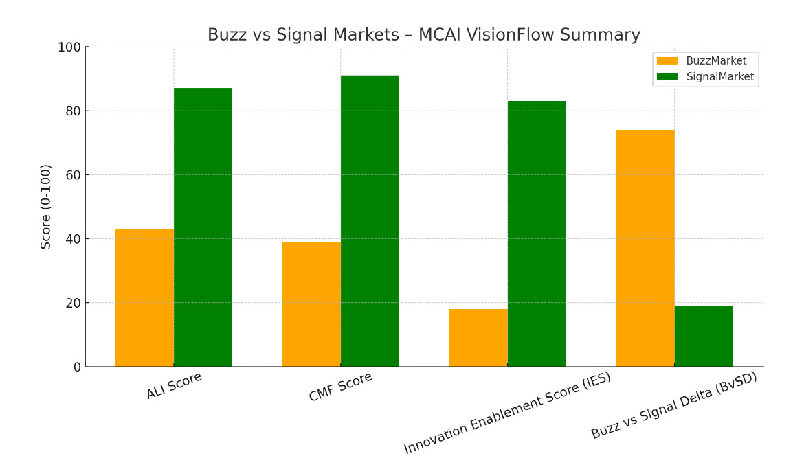 This white paper uses the InnovationVision framework developed by MindCast AI LLC to define, differentiate, and simulate the current AI ecosystem across three layers: dominant platforms, the buzz market, and the signal market. Through structured analysis and simulation, we offer a roadmap for identifying where enablement—defined as the expansion of what is possible—is actually occurring.