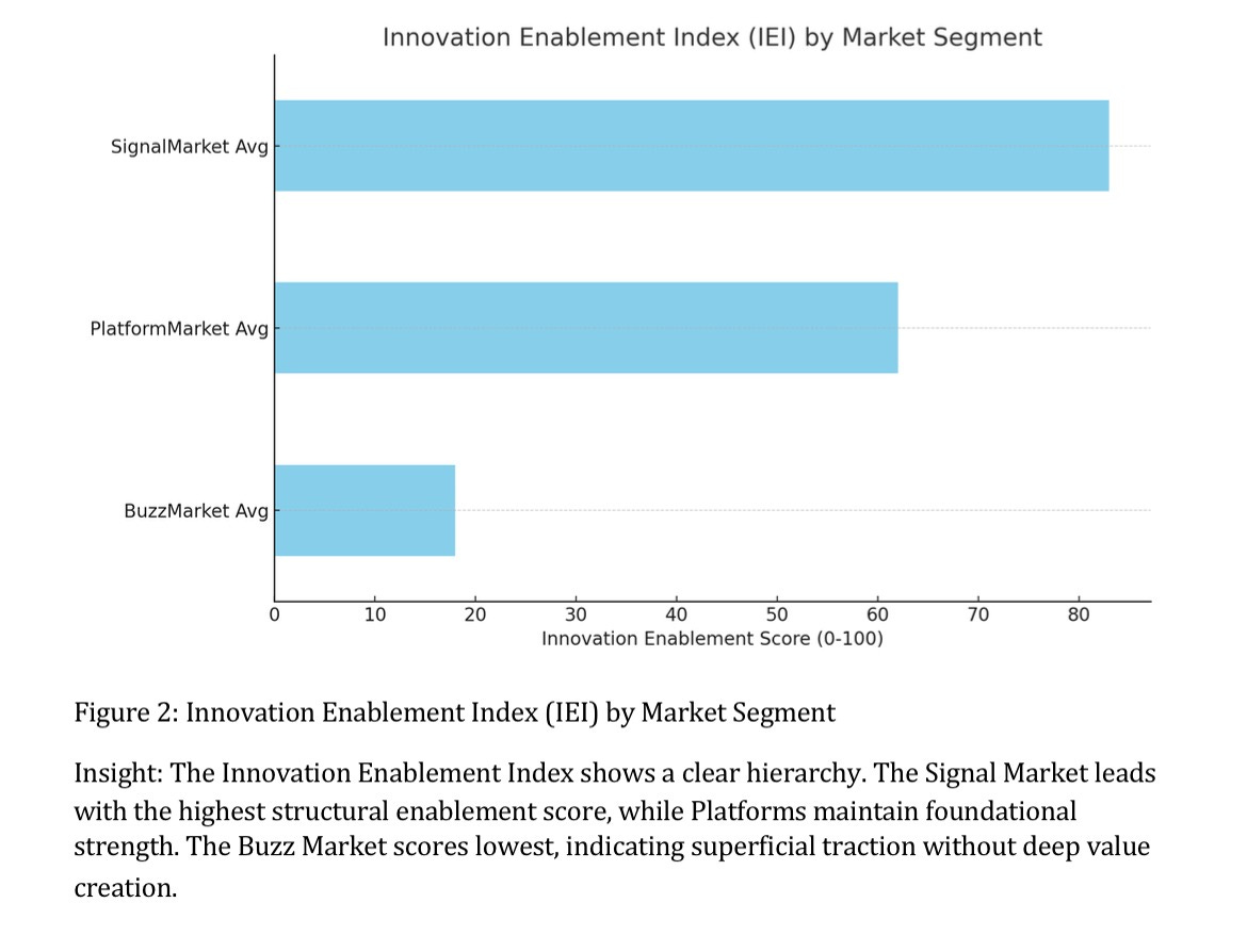 Insight: The Innovation Enablement Index shows a clear hierarchy. The Signal Market leads with the highest structural enablement score, while Platforms maintain foundational strength. The Buzz Market scores lowest, indicating superficial traction without deep value creation.