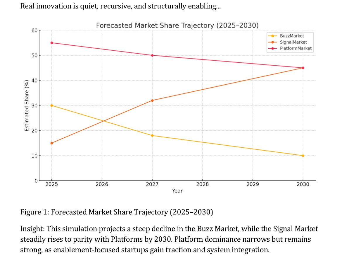 Insight: This simulation projects a steep decline in the Buzz Market, while the Signal Market steadily rises to parity with Platforms by 2030. Platform dominance narrows but remains strong, as enablement-focused startups gain traction and system integration.
