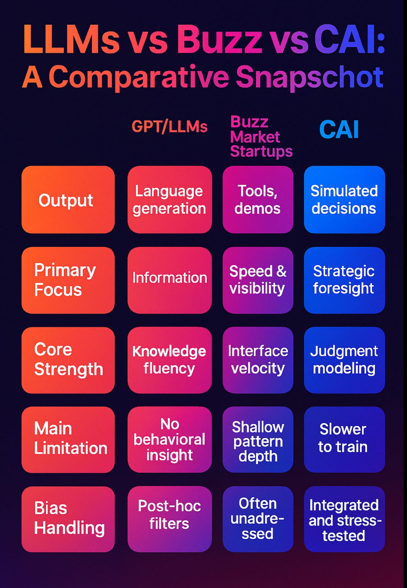 Artificial Intelligence is advancing fast—but not all systems solve the same problems. Large Language Models (LLMs) like GPT deliver fast, fluid responses. Buzz market geared startups build innovative tools, experiment quickly, and move ideas into play. These approaches have value—but they don’t simulate how people actually think, assess risk, or make decisions.