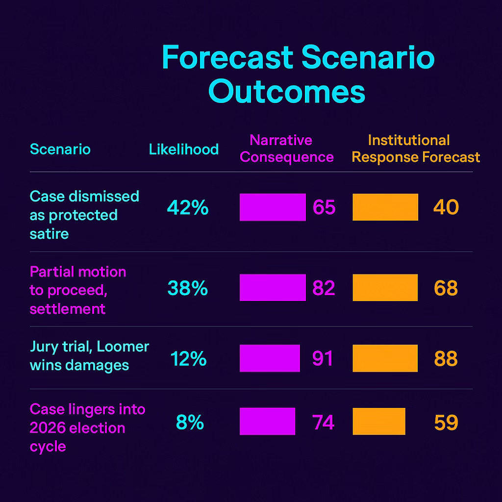 MindCast AI assigns confidence levels of 70% for dismissal, 85% for settlement, 55% for a jury verdict in Loomer’s favor, and 65% for the case lingering into the 2026 election cycle—reflecting varying degrees of legal predictability and narrative volatility.