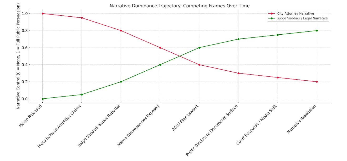 Judge Vaddadi had recently ruled to disqualify a city prosecutor due to conflict of interest—an action legally upheld. Shortly after, a memo was distributed within the City Attorney’s Office containing misleading and fabricated summaries of her rulings. These examples were not routed through internal channels or appealed. Instead, they were used to justify a sweeping Affidavit of Prejudice policy that prevented Judge Vaddadi from hearing all criminal matters.