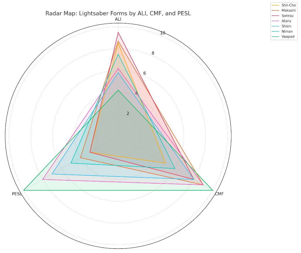Together, these forms act as a classification system for brand behavior under pressure—revealing how identity, performance, and narrative alignment shape strategic outcomes. Lightsaber Vision allows these combat philosophies to be stress-tested across market simulations, transforming mythic patterns into predictive insight.