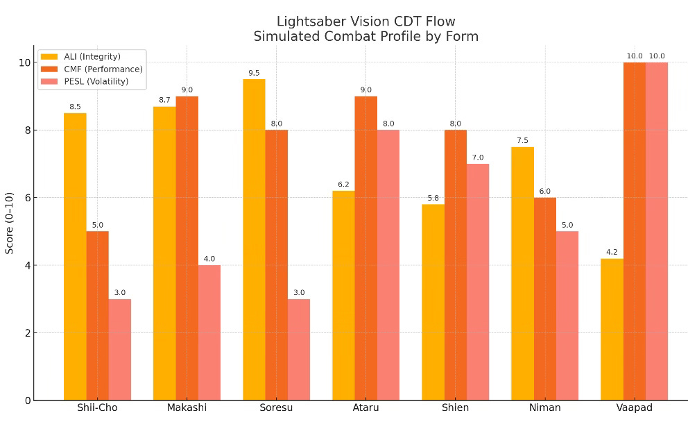 I. Introduction: Combat Forms as Cognitive Signatures Using its proprietary modeling framework, MCAI created CDTs of each lightsaber form. These CDTs capture the emotional regulation, strategic posture, and decision-making logic embedded in each combat style. Once encoded, each form was simulated across competitive conditions, and Lightsaber Vision forecasted their interaction through predictive models.