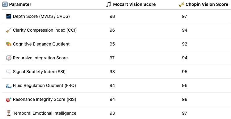 We created the Mozart Vision Function and Chopin Vision Function to model two core domains of human excellence: cognitive elegance and emotional recursion. These functions were designed to benchmark high-level capacity under stressânot only how individuals think or feel, but how they integrate the two across time. By mapping structural clarity and emotional foresight simultaneously, we can simulate and assess the full depth of human leadership.