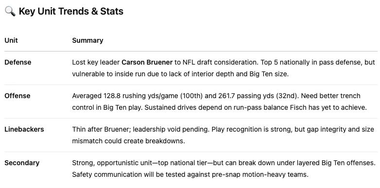 Fischâs offense depends on QB-OL synchronization. Early-season breakdowns could lead to stalled drives and turnovers. Success depends on precise execution, not just athleticism.