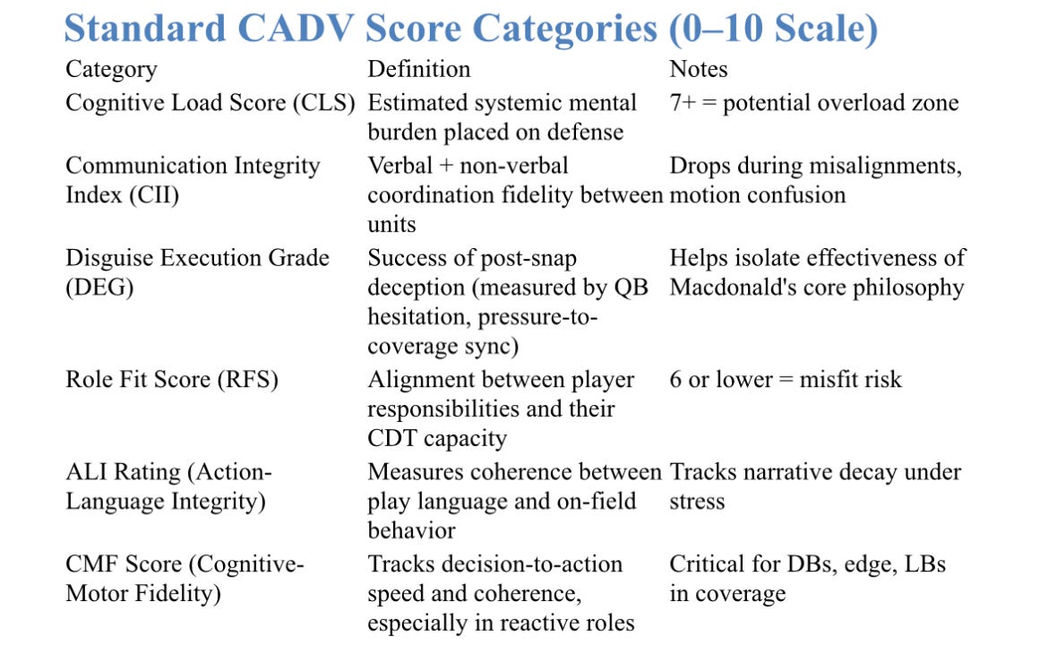 To ensure consistency, comparability, and actionable clarity across the 2025 season, this report introduces a standardized weekly scoring system for evaluating defensive system integration. The scoring system aligns with the MCAI CADV framework and is built around six core categories that assess cognitive load, communication fidelity, role fit, and execution coherence. Each score operates on a 0–10 scale, producing both detailed diagnostic insights and a single composite score to track systemic integrity over time. These metrics allow coaching staff and analysts to quickly identify performance risk zones, monitor player-system alignment, and inform game-week preparation with objective simulation-backed data.