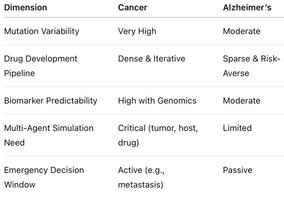 Cancer’s mutation-driven volatility and high treatment response diversity create more points of simulation leverage—meaning quantum computing can do more, earlier, and more often. Alzheimer's simulation relies more on long-term progression modeling and protein folding, both of which are important but evolve more slowly.