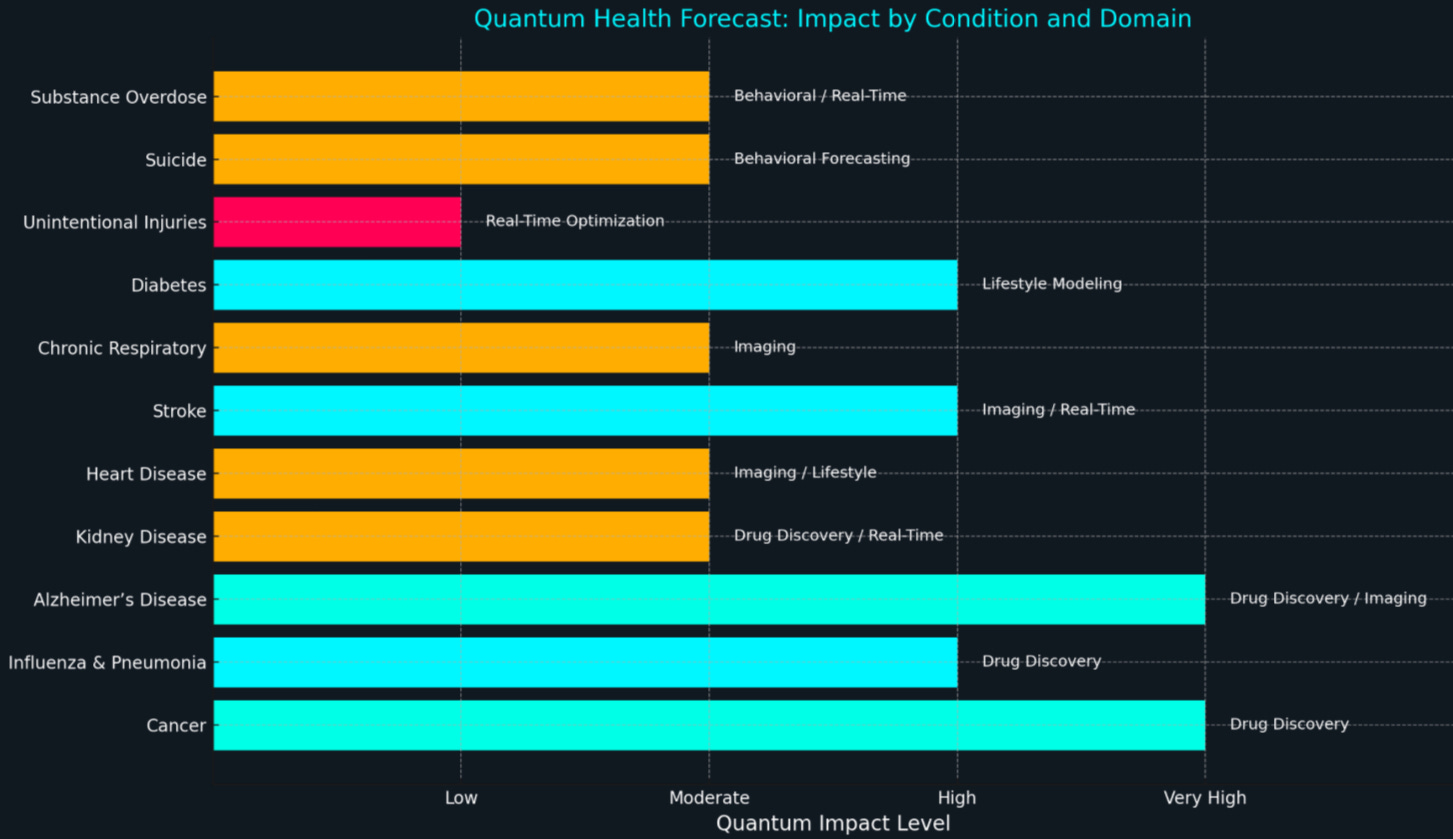 Cancer emerges as the clearest strategic focus. It is not only one of the most prevalent and deadly diseases, but also the one most aligned with the computational strengths of quantum simulation. Cancer is driven by chaotic molecular structures, dynamic mutation pathways, and evolving resistance patterns. These traits, while challenging for classical systems, are precisely the kind of high-dimensional complexity quantum computing was built to explore.