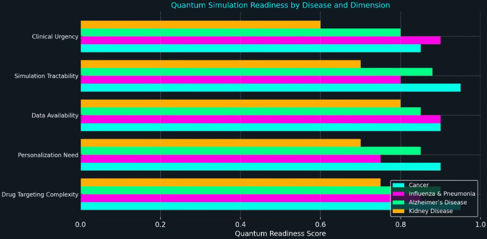 Diseases like cancer, influenza and pneumonia, Alzheimer’s disease, and kidney disease stand out. Their molecular roots and variability make them ideal candidates for quantum-enhanced drug discovery and adaptive therapy modeling.