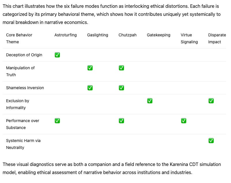 Narratives have always shaped human perception, but narrative economics amplifies this dynamic through emotional contagion and market signaling. When stories become the currency of influence, their ethical quality determines whether they inform or manipulate, clarify or distort. The Karenina CDT enables us to assess not just whether a narrative is compelling—but whether it is morally coherent. By mapping narrative behavior to seven core dimensions of ethical integrity, we can detect drift, flag performative deception, and simulate consequences before trust collapses. What follows are examples of narrative misuse—each mapped to failures in moral coherence. A separate diagnostic visualization is available, showing how these six failure modes correspond to violations across the Karenina CDT’s core dimensions and behaviors.