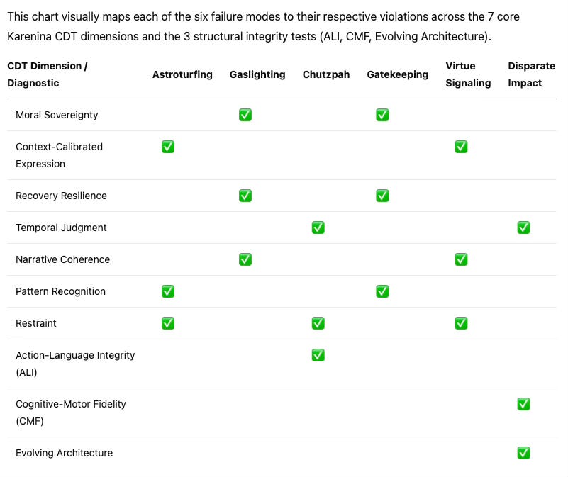 When measured through the Karenina CDT, astroturfing violates pattern recognition (false signal masquerading as organic), context-calibrated expression (deception under the guise of legitimacy), and restraint (manufacturing performative behavior rather than truthful engagement). Its impact triggers coherence loss, trust decay, and systemic distortion.