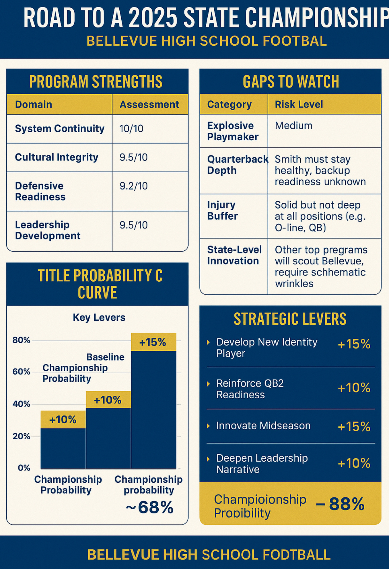 MindCast AI places Bellevue’s baseline probability of winning the 2025 state championship at 68%—a figure that reflects structural readiness, leadership maturity, and system cohesion. However, this probability isn’t fixed. It can increase significantly by activating four controllable variables.