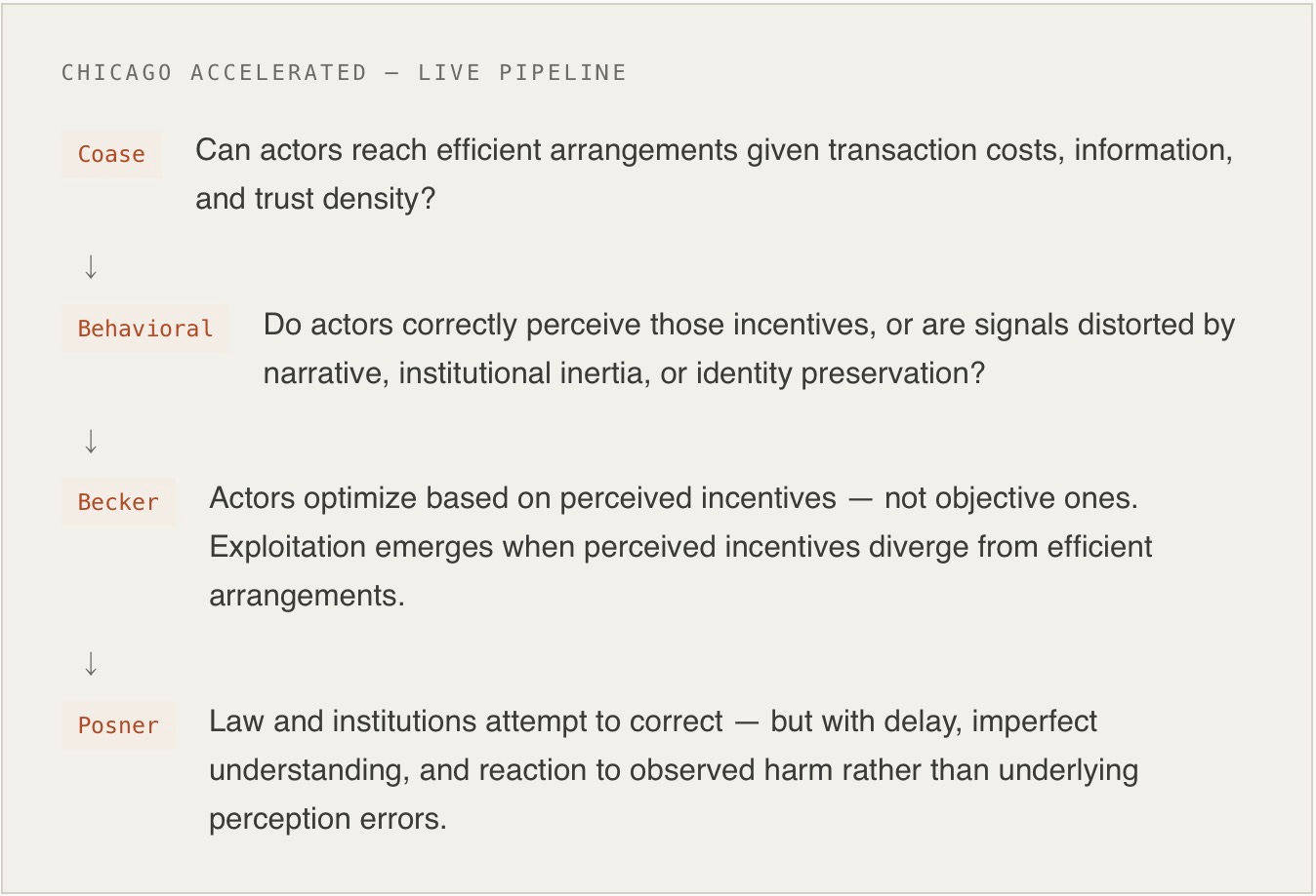 Classical Chicago Law and Economics analyzes coordination, behavioral response, and legal correction as three discrete stages. MindCast Chicago Accelerated collapses them into a continuous loop — and inserts the behavioral perception layer that classical Chicago suppressed. Incentives do not act directly. Incentives are filtered through perception before they produce behavior. That single insertion transforms what would otherwise be an explanatory sequence into a predictive mechanism.