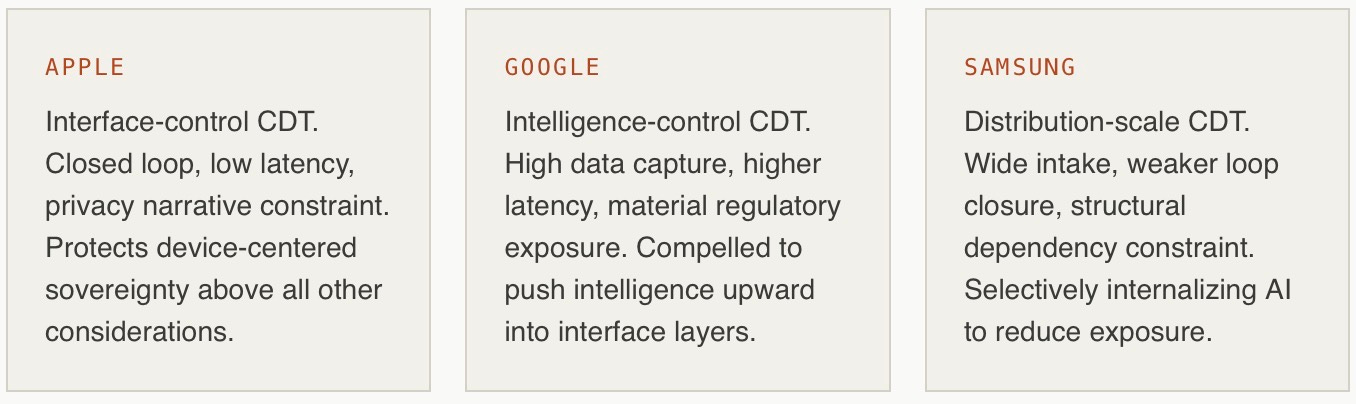 Notice what the CDT profiles reveal that a standard competitive analysis would not: each firm is not simply choosing a strategy from a menu of options. Each is constrained by its own architecture. Apple cannot aggressively monetize data without destroying the narrative that anchors its premium pricing. Google cannot retreat from interface surfaces without ceding the control layer its entire business model requires. Samsung cannot commit to full AI internalization without risking the distribution flexibility that is its core competitive asset. Constraint geometry, not just incentives, determines what each firm will actually do.
