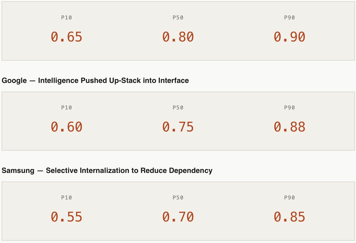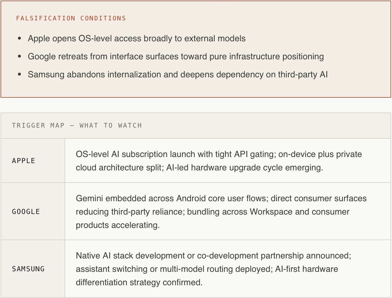 The probability bands reflect the constraint architecture of each CDT, not just market dynamics. Apple's high-end range reflects tight loop closure and low narrative risk — the strategy is coherent with its installed grammar. Google's slightly wider spread reflects regulatory exposure that could compress or accelerate the move up-stack depending on enforcement timing. Samsung's lower floor reflects genuine dependency risk that internalization has not yet resolved. The falsification conditions below specify exactly what observable signals would invalidate each path.