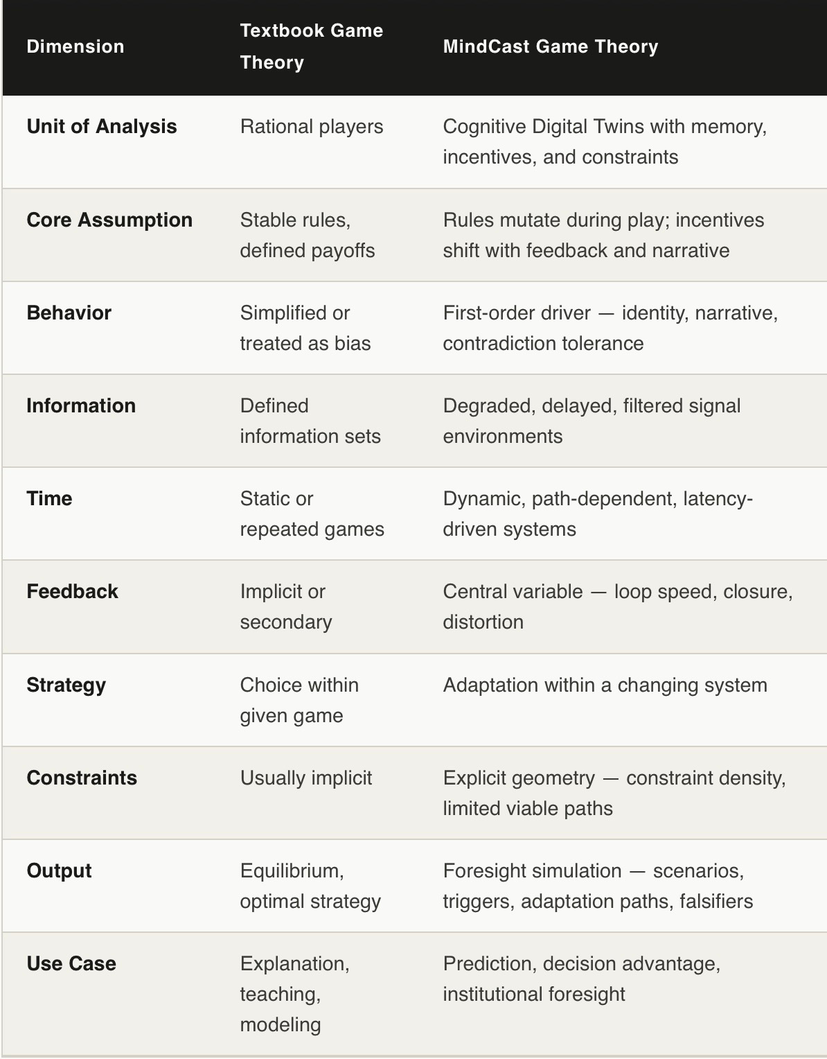 The table below consolidates the structural differences across ten analytical dimensions. Each dimension represents a genuine architectural choice — not a matter of degree, but a difference in what the framework is built to do. Taken together, the ten dimensions define why MindCast Game Theory produces a different class of output than textbook frameworks, and why that difference is consequential for foresight rather than merely descriptive.