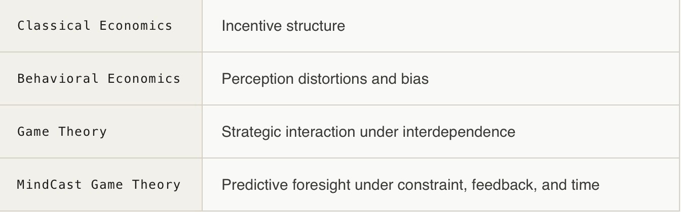 Each discipline in the stack below addresses a different layer of why actors behave the way they do. Classical economics sets the incentive structure. Behavioral economics explains why actors misread it. Game theory maps how misreading plays out across competing actors. MindCast Game Theory runs that full stack forward under real-world conditions — feedback latency, narrative constraint, structural geometry — and produces a forecast rather than a description.