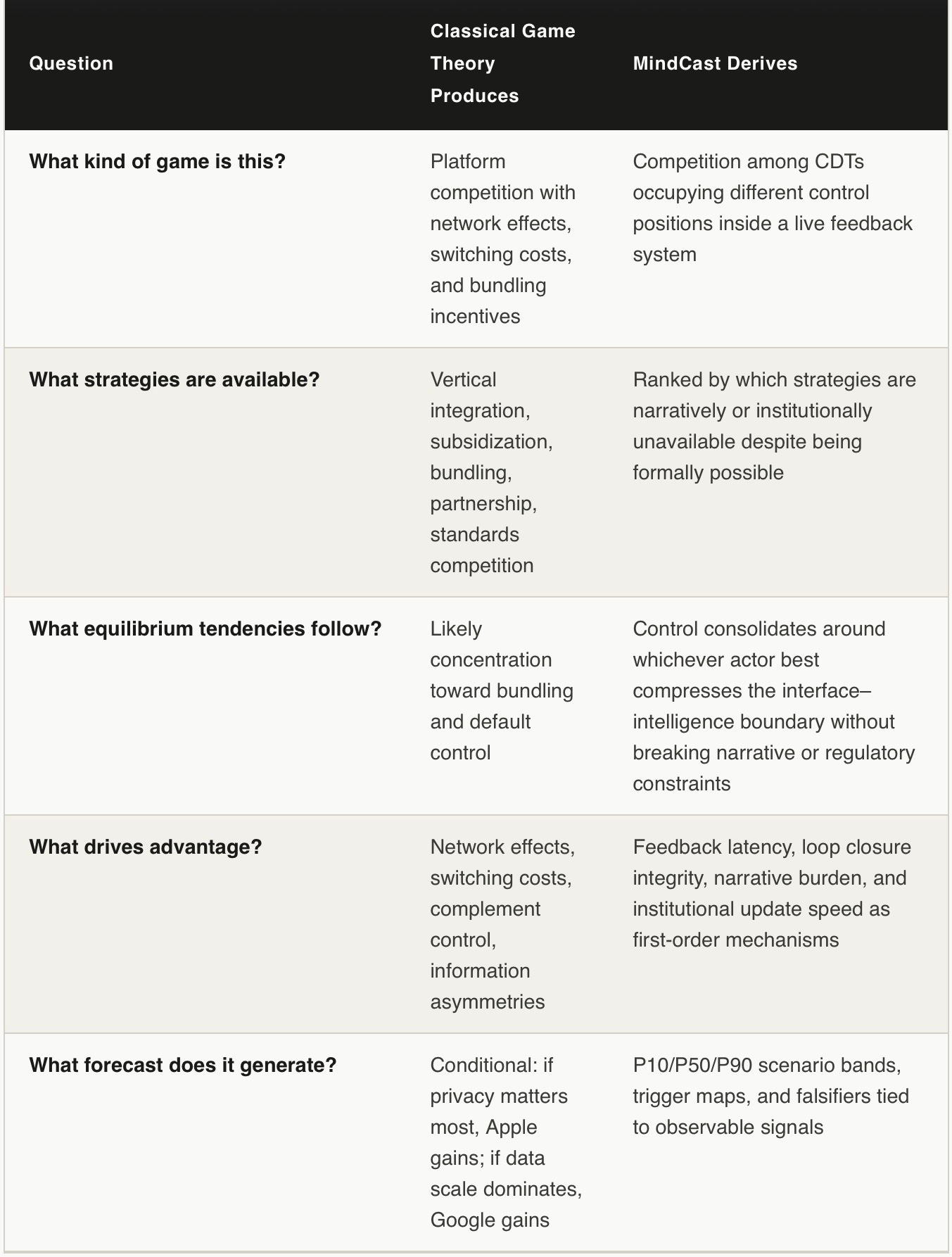The last row is the one that matters most for practitioners. Classical game theory’s forecast is conditional — it tells you which firm wins under which assumption, leaving the reader to judge which assumption holds. MindCast’s forecast is directional and falsifiable — it tells you which path each firm is most likely on, what probability attaches to that path, and which observable signals would prove the prediction wrong. Descriptions are useful for understanding a field. Predictions are what practitioners need to act before the public story catches up.