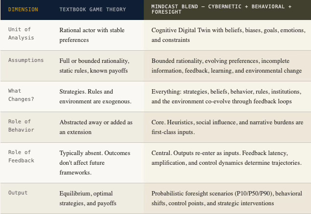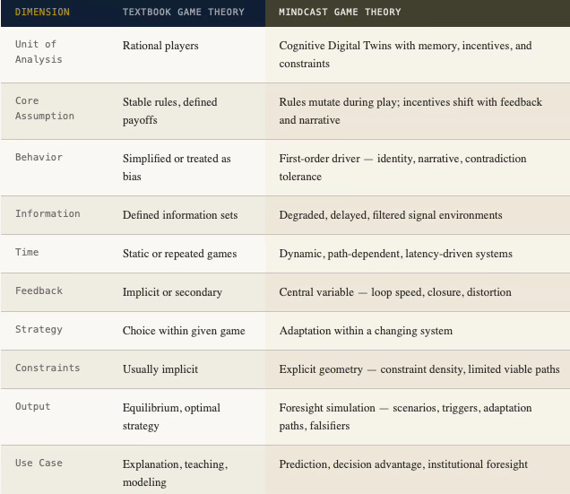 Textbook game theory gains precision by simplifying the player. MindCast makes the opposite move. A Cognitive Digital Twin is not merely a utility function — it is a model of a specific institutional actor carrying the full weight of behavioral architecture, institutional memory, and feedback latency that determine what the actor can actually do under pressure.