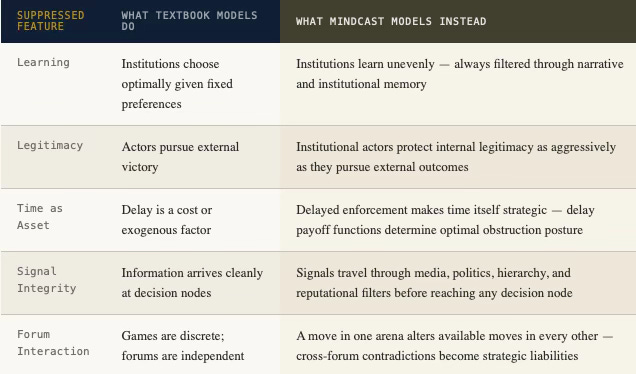 Real institutional games depend on exactly the features textbook models suppress for tractability. Five structural mismatches explain why MindCast Game Theory was built as a distinct system rather than an extension.